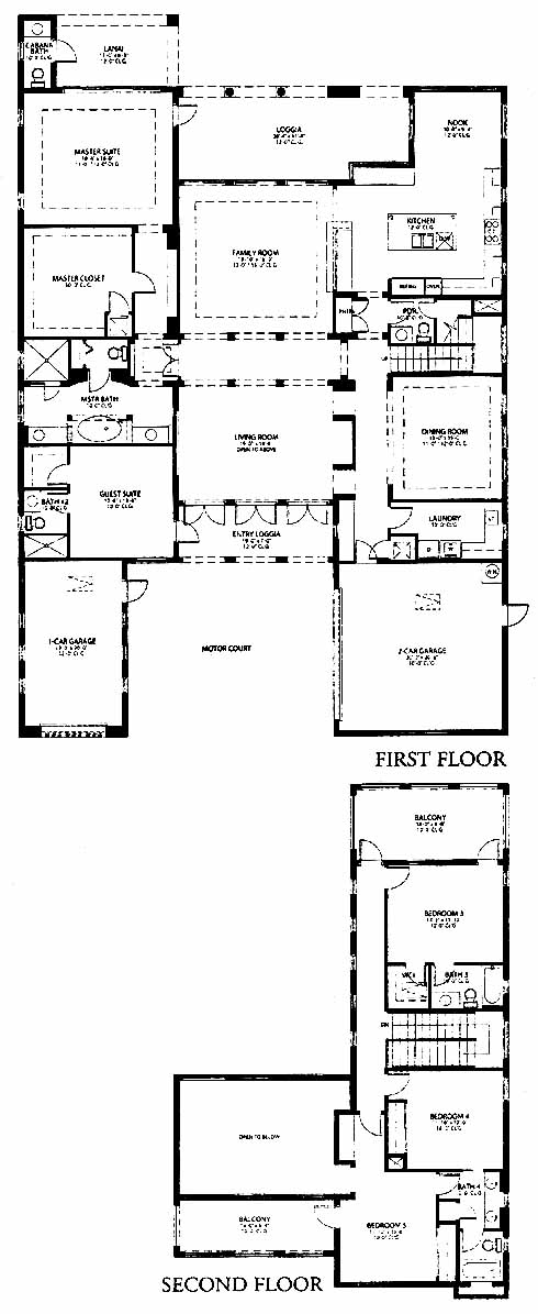 Estate home with something for everyone in the family. The first-floor master suite includes a private lanai, a wardrobe closet and master bath with dual vanities and claw-foot tub. The guest suite at the front of the home has a private bath and separate entrance from the entry loggia. Formal living and dining rooms are located at the front of the home. The family room in the back is a nice spot for entertaining guests and includes access to the loggia outside. The kitchen has a pantry and island workspace while overlooking the nook in the back. The second floor has three more bedrooms, including one with a private bath and two with balcony access.