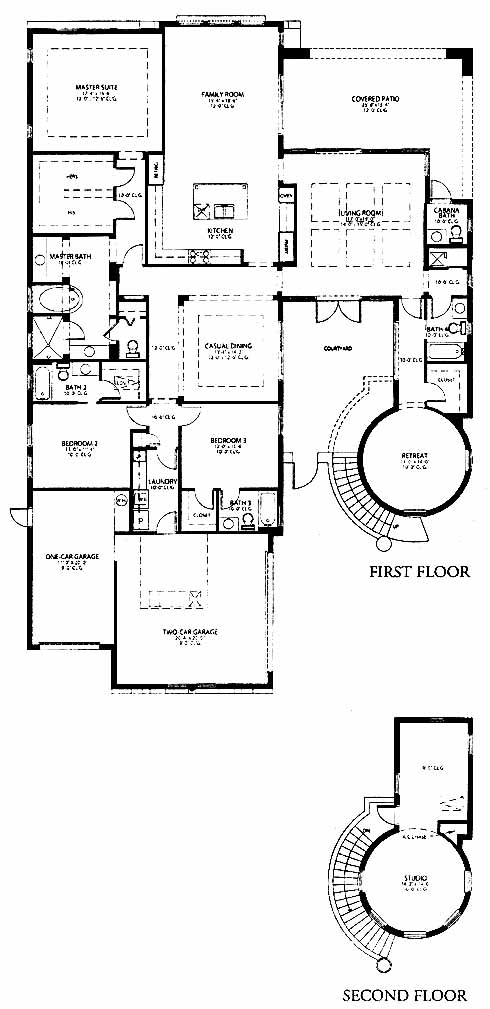 Private courtyard leads to the formal living room with views of the covered patio in the back. Nearby is a circular retreat area that makes a nice guest bedroom. The kitchen with pantry and island workspace overlooks the family room while having close access to the casual dining room. The master suite in the back includes his and her walk-in closet, and a master bath with dual vanities, soaking tub and separate shower. Two more bedrooms each have a private bath. Access the second-floor studio from the courtyard outside.