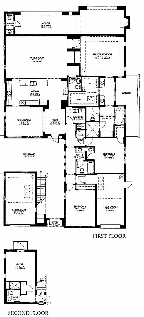Home featuring a spacious family room with media niche that leads to the loggia with outdoor fireplace. The kitchen has ample counterspace for preparing meals while the formal dining room is closeby. Two bedrooms at the front of the home share a bath and have close access to the laundry room. The master bedroom in the back has private loggia access, his and her walk-in closet and a master bath with dual vanities, garden tub and two-person shower. The second-floor guest room with private bath rounds out this attractive home.