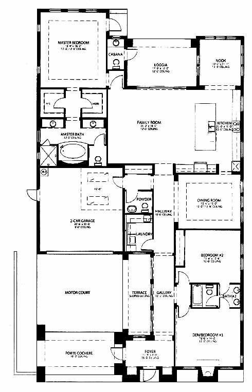 The foyer fo this home leads you to the gallery with views of the terrace outside. To one side of the gallery are two bedrooms with a Jack-n-Jill bath. Next is the formal dining room with access to the kitchen where you'll have plenty of counterspace for preparing meals. The nook in the back overlooks the loggia outside. Access that same loggia from the family room where you can spend a relaxing weekend. The master bedroom in the back includes a private patio, his and her walk-in closets and a master bath with dual vanities, tub and separate shower.