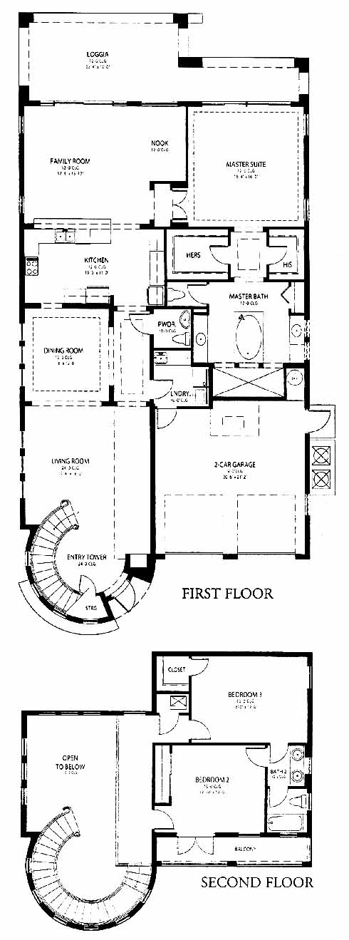 Villa home with attractive entry tower that has a winding staircase that leads to the second floor. Living and dining rooms welcome guests into the home from the entry tower. Next is the kitchen with ample counterspace for preparing meals while overlooking the family room and nook. The first-floor master suite includes his and her walk-in closets and a master bath with dual vanities, a garden tub and a separate shower. Access the loggia from both the family room and the master suite. The second floor has two more bedrooms, a shared bath and access to a private balcony from one of the bedrooms.