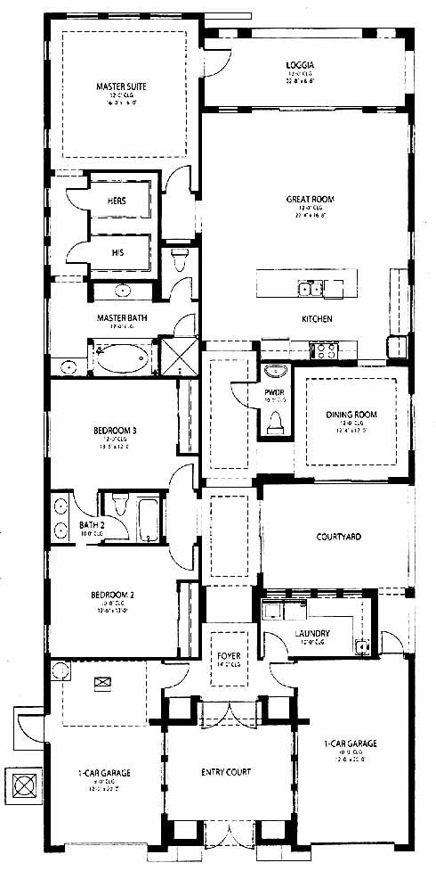 Entry court leads to the foyer inside with access to a one-car garage on either side. Next is two bedrooms with a shared Jack-n-Jill bath. The formal dining room overlooks the private courtyard through a sliding door. The nearby kitchen includes an island workspace while overlooking the great room with loggia access. The master suite includes his and her walk-in closets, private loggia access and a master bath with dual vanities, tub and separate shower.