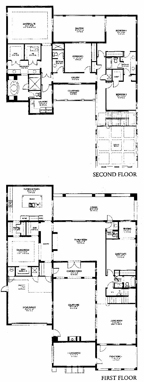 Estate home with large front porch that welcomes guests to the front door. Once inside, the living room overlooks the private courtyard in the center of the home. Entertain friends in the large family room with loggia and courtyard access on either side. The nearby guest suite offers privacy with its own reading room and private loggia access. The Florida kitchen has an island workspace and pantry while the formal dining room includes a wine cellar and bar area. The second-floor master suite has private balcony access, his and her walk-in closets and a luxurious master bath with dual vanities, tub and separate shower. Two more bedrooms on the opposite side of the home share a bath between them. A fifth bedroom has balcony access and close access to a bath.