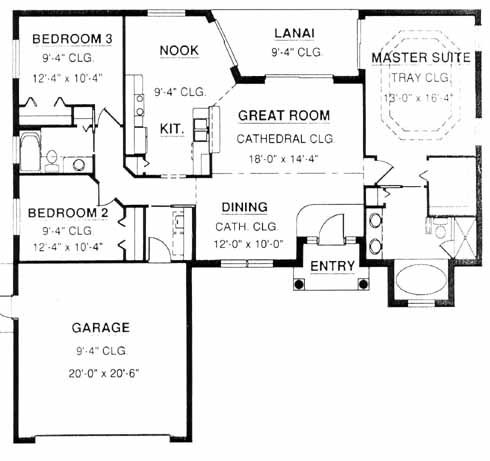 This home has a formal dining room to one side of the foyer entrance. The great room includes access to the lanai, as well as a dramatic cathedral ceiling. The kitchen has a pantry and ample counterspace for preparing meals while opening into the nook area. The master suite with tray ceiling also includes a walk-in closet and a master bath with double vanity, tub and separate shower. Two more bedrooms share a bath between them. Price includes a standard one-third acre homesite.