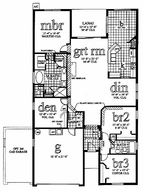 Two bedrooms and a shared bath are to one side of the foyer entrance. The master bedroom is located in the back and includes his and her walk-in closets and a master bath with garden tub and separate shower. The den makes a nice home office. The dining room leads to the kitchen with pantry. The breakfast nook in the back is perfect for reading the morning paper. The great room has access to the lanai through sliding doors and an optional fireplace is available.