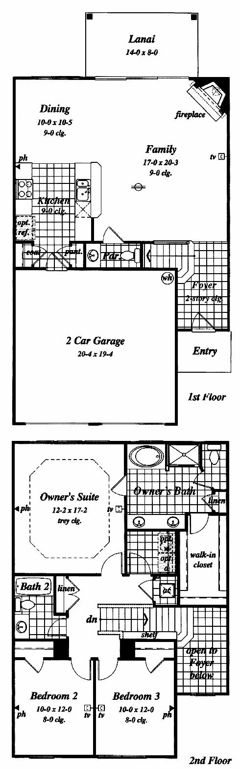 This townhome has a dramatic two-story foyer entrance that leads to the spacious family room with fireplace and lanai access. The dining room nearby opens into the kitchen with pantry. The second-floor owner's suite includes a walk-in closet and owner's bath with double vanity, tub and separate shower. Two more bedrooms at the front share a bath.