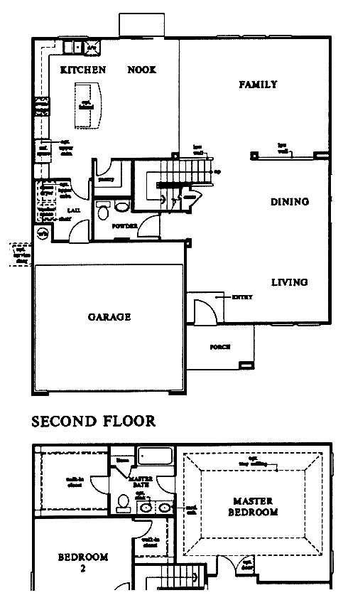 This home has a living and dining room space at the entrance. The family room in the back is separated from the front by a low wall. The nook leads to the kitchen with walk-in pantry and optional island workspace. The second-floor master bedroom includes a walk-in closet and master bath with double vanity, tub and separate shower. Two more bedrooms share a bath.