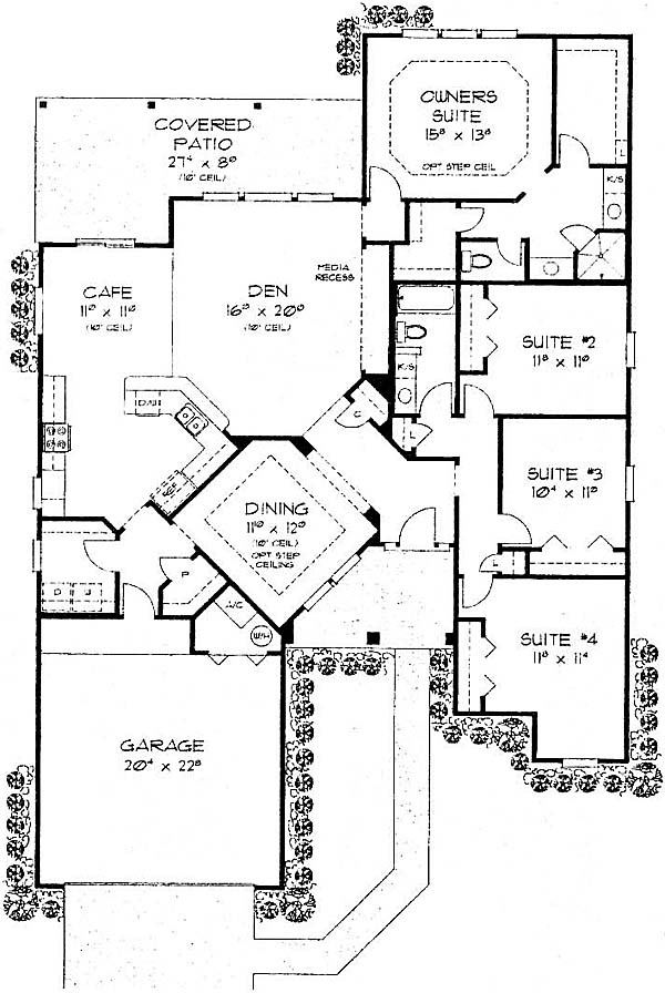 This unique floor plan is sure to impress anyone who sees it. As you enter the home you'll pass the access to the 2nd, 3rd and 4th suites and hall bath. As you move past the dining room with optional step ceiling you'll come to the den. From the den you can access the massive owner's suite with optional step ceiling and master bath with walk-in closet and dual vanities. Also, open to the den is the kitchen with wrap around counter and cafe area.