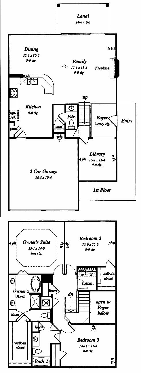 This townhome has a two-story foyer entrance with a library to one side that makes a nice home office. The spacious family room with fireplace is a nice spot to entertain guests and includes access to the lanai outside. The kitchen with pantry overlooks the dining room. The second-floor owner's suite has a walk-in closet and owner's bath with double vanity, tub and separate shower. Two more bedrooms share a bath.