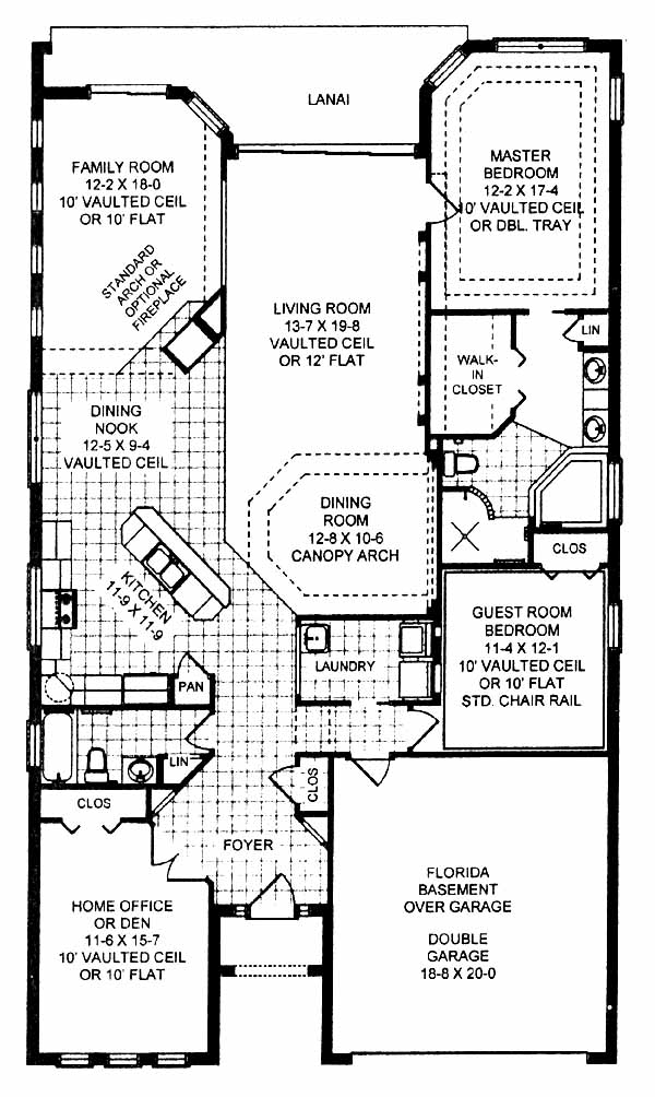 This home is only 40 feet wide and can be built on a more economically narrow lot. The lot is included in the price. A very stylish exterior is apparent with the wrought iron and bay windows. There is a Florida basement over the garage for extra storage. All rooms have 10 feet vaulted or flat ceilings. Tile begins at the foyer and extends down the hallway to the kitchen and dining nook. Both baths also have tiled floors. The roofed lanai in the rear lends itself to an optional pool. The front bedroom can also be used as a den or office if desired.