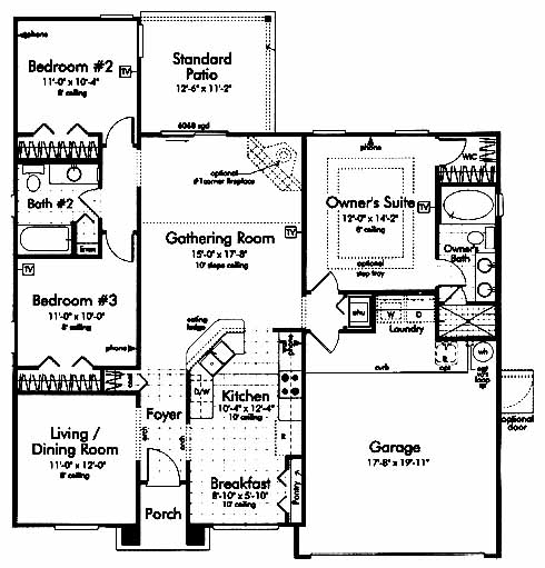 The kitchen and breakfast room are located to one side of the foyer entrance and includes a tiled floor, pantry and eating ledge. To the other side is the living and dining room space. The spacious gathering room with patio access and optional fireplace is a nice area to entertain friends and family. The large owner's suite includes a walk-in closet and owner's bath with double vanity, tub and separate shower. Two more bedrooms on the opposite side of the home share a bath between them.