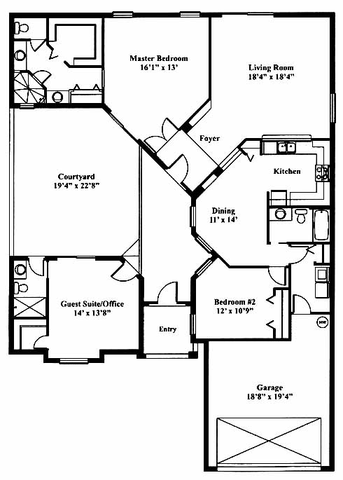 This home includes a private courtyard at the entry. Once inside, the spacious living room will serve as a nice spot to entertain guests. The dining room leads to the kitchen with pantry. The master bedroom includes private access to the courtyard, a walk-in closet and a master bath with dual vanities and shower. A second bedroom has close access to a bath and the laundry room. The guest suite with private bath could make a great home office.