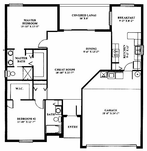 This home features a spacious master bedroom that includes a walk-in closet and master bath with double vanity. A second bedroom at the front of the home also has a large walk-in closet and is close to a bath. The great room and dining room combine to create a large, open space with access to the covered lanai outside. The kitchen with pantry opens into the breakfast room at the back.