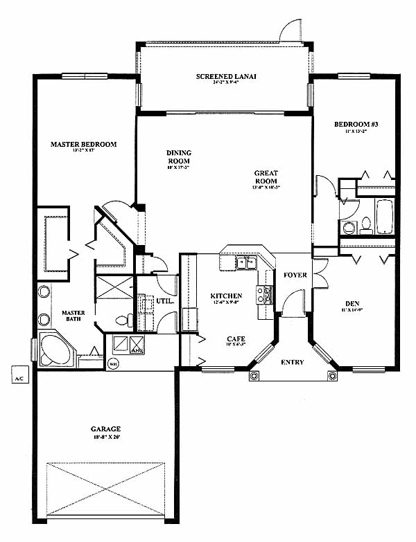 This home has a large den/bedroom at the front of the home that is great for use as an office. The kitchen is located on the opposite side of the foyer and includes a cafe area. Combined dining and great rooms give a very open feel to the design. Large sliding doors that run the length of the two rooms provide plenty of natural light and access to the screened lanai. The master suite includes his and her walk-in closets and a large private bath with soaking tub, separate shower and double vanity sinks.