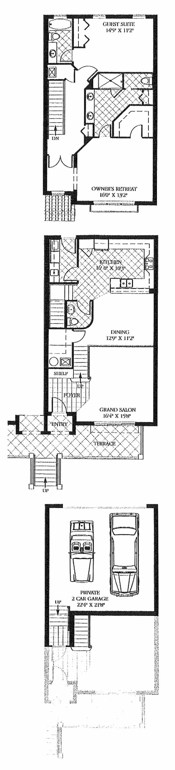 Two bedroom townhome featuring a spacious kitchen that overlooks the dining room. A grand salon at the front includes access to the terrace. An owner's suite on the third level includes a walk-in closet and private bath. The guest suite also includes a private bath that allows for maximum privacy for those visiting.