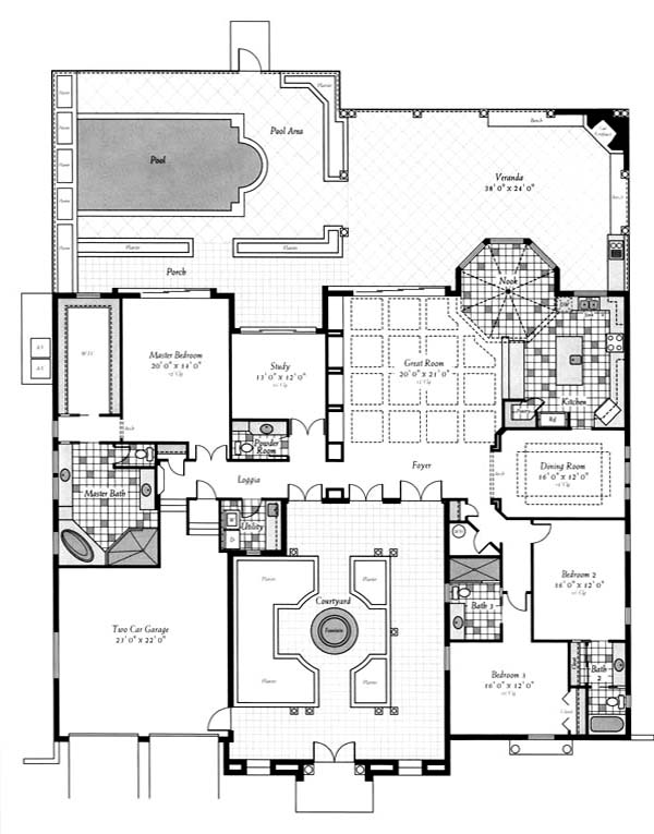 As you step through the iron gates of the Veranda, you are enveloped by the tranquility of the spacious courtyard, featuring a charming fountain and lush foliage. Upon entering the stately home, you are immediately aware of the strong architectural detailing evident in the barrel vaults, iron grillwork, stone accents and wood beams, which create a warm interior for family and friends. A key focal point of the home is the outdoor family room which boasts a stunning stone fireplace, full equipped summer kitchen, a pass-through bar from the interior kitchen, and built-in seating area. This unique room overlooks the pool, anchored by a pergola at the far end, and the shimmering lake behind. The single-story, three bedroom, three and 1/2 bath home incorporates a bonus room over the garage.