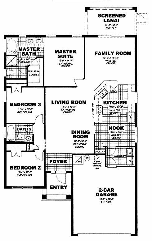 This home has a huge master suite with cathedral ceiling, walk-in closet and private bath. Two more bedrooms share a bath between them. The living and dining rooms are at the entrance of the home and lead to the family in the back that includes access to the screened lanai. The kitchen includes a pantry, ample counter space and opens into the nook where the laundry room is accessible.