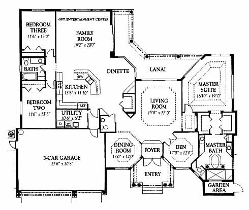 This home's foyer is surrounded by a dining room and den at either side and a living room directly in front. The spacious master suite includes his and her walk-in closets and a luxurious private bath with garden tub. The family room with optional entertainment center will be a great spot to entertain. The kitchen has a walk-in pantry, ample counter space and overlooks the dinette. Two more bedrooms to the left share a bath between them.