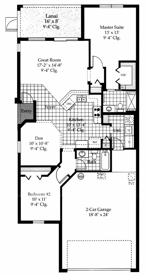 This cottage home has a spacious great room at the entrance that includes access to the lanai and has plenty of room for friends and family. The master suite at the back includes a walk-in closet and private bath. The den to one side of the foyer makes a great home office. The kitchen has ample counter space, a pantry and access to the utility room. A second bedroom is located at the front of the home.