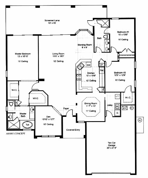 This home has a covered entry that leads to the foyer and spacious living room with 12-foot ceiling. A den and dining room are at either side of the foyer. Access the kitchen from either the dining or morning room. A pantry and ample counter space are just a couple of the highlights included in the kitchen. Two bedrooms to one side of the home include ample closet space and share a large bath. The master suite includes his and her walk-in closets, private bath with tub and separate shower and private access to the screened lanai.