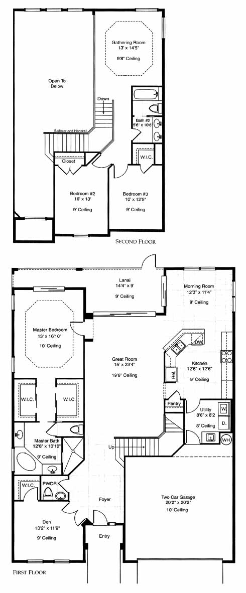 This two-story home has a first-floor master suite with his and her walk-in closets and a private bath with his and her sinks, tub and separate shower. A den at the front makes a nice home office and includes a walk-in closet. The centralized great room will be a popular spot for everyone in the family with its large size and access to the lanai in the back. The spacious kitchen includes a pantry, ample counter space and access to the utility room and morning room. The second floor has two more bedrooms, a bath and a gathering room with views of the great room below.
