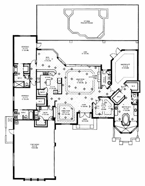 This home has ceramic tile flooring throughout most of the design. A dining room and study are at either side of the foyer entrance. The spacious great room includes access to the lanai and has an option for an entertainment center. The kitchen has an island workspace, walk-in pantry and overlooks the nook. Two bedrooms to one side of the home each have a private bath and walk-in closet. The master suite on the other side includes his and her walk-in closets, private bath with garden tub and two-person shower and private access to the lanai.