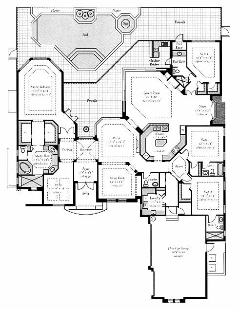 This Mediterranean-style home has large rooms and an open feel to the design. A study, vestibule, reception, parlor and dining room surround the foyer entrance. The luxurious master suite to one side includes his and her walk-in closets and a private bath with double vanity, tub and a separate large shower. Three more suites on the opposite side of the home each include a private bath and walk-in closet. The centralized kitchen includes and island workspace and views of the gorgeous leisure room that has sliding doors that are on two sides. An outdoor kitchen can be found on the veranda along with a gorgeous pool and spa.