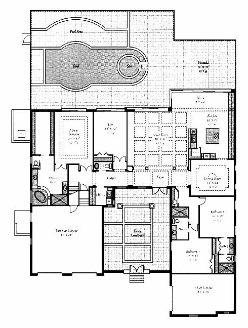 This home has a beautiful entry courtyard that leads to a double door entry. Once inside, the great room will be immediately noticed for its size and views of the veranda and pool in the back through sliding doors. The nook also has access to the veranda outside and to the kitchen. An island workspace and pantry highlight the kitchen that leads to the dining room. Two bedrooms on one side of the home both have private baths, allowing for maximum privacy to everyone. The master suite on the opposite side has a huge walk-in closet, private bath with shower and separate tub and access to the pool through sliding doors. Close by is the den that makes a nice home office or reading room.