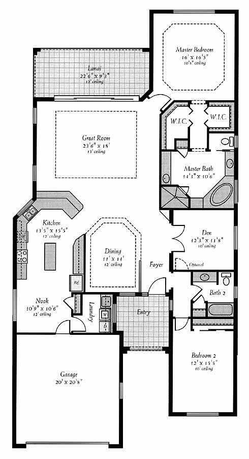 This villa home has a dining room to one side of the foyer before leading to the large great room with access to the lanai outside. The master suite at the back of the home includes his and her walk-in closets and a private bath with soaking tub and separate shower. A second bedroom is located at the front of the home. The den makes a nice home office or reading room. The large kitchen includes an island workspace, pantry and opens into the nook.