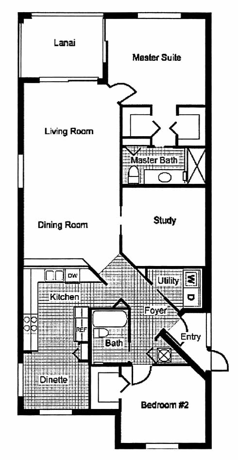 This condominium home has a side entrance with the secondary bedroom at the front of the home with walk-in closet. The kitchen includes ample counter space and a pantry and opens into the dinette. A large combined dining and living room is a great spot for watching the big game or entertaining friends. The study makes a nice home office. The master suite includes his and her walk-in closets and a private bath. Access the lanai from both the living room and master suite.