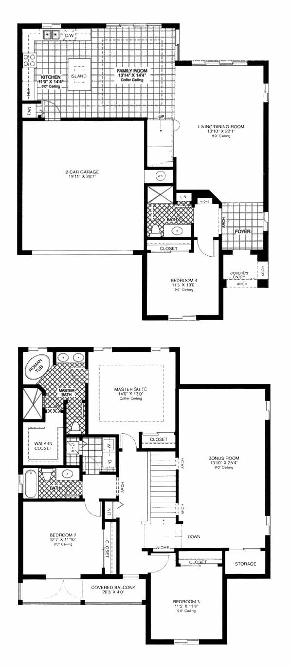 Two-story home with family room, island kitchen, bonus room, and two-car garage.
