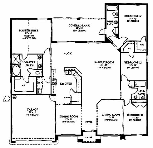 This home includes dining and living rooms with ten-foot ceilings at either side of the foyer entrance. The spacious family room is great for entertaining guests. The kitchen includes a walk-in pantry and opens into the nook. Three large bedrooms with ample closet space are to one side of the home. The master suite to the other side includes a vaulted ceiling, oversized walk-in closet and private bath. Access to the covered lanai from the master suite, the nook and the pool bath.