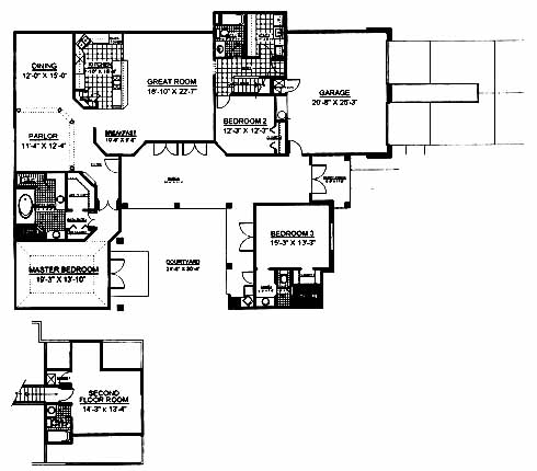 This home has a beautiful private porch and courtyard upon passing through the entry porch. Once inside the home, a parlor and dining room are at the foyer entrance. The kitchen with pantry and bar-top leads to the breakfast room. The great room is perfect for entertaining guests and includes access to the porch through French doors. The master bedroom includes his and her closets and a master bath with dual vanities, a soaking tub and separate shower. A second bedroom at the opposite end of the home has close access to a bath and to the utility room. A bedroom separate from the rest of the home makes a nice guest suite with its own bath. A second floor bedroom with bath rounds out this attractive home.