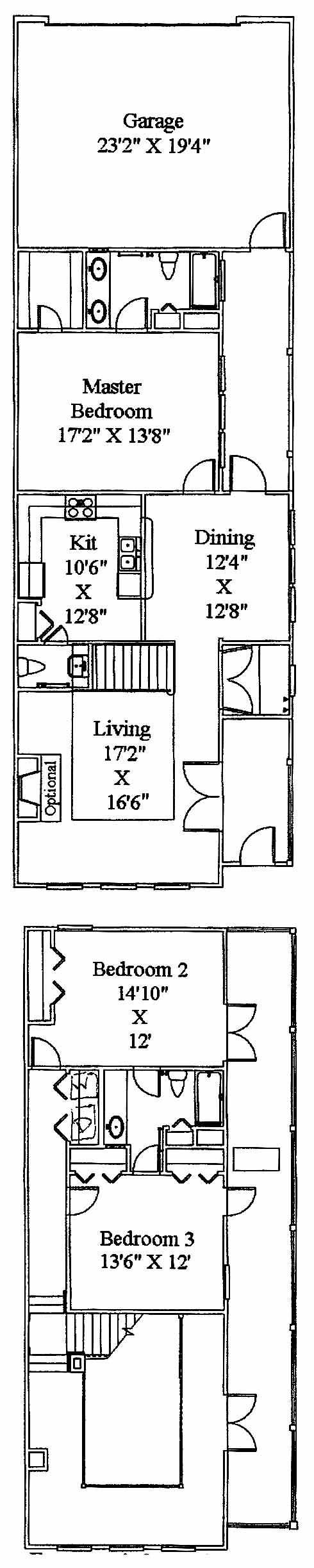 This two-story home has a large living room with fireplace at the foyer entrance. The dining room leads to the kitchen with pantry. The first-floor master bedroom includes a walk-in closet and master bath with double vanity. The second floor has two more bedrooms and a shared bath.