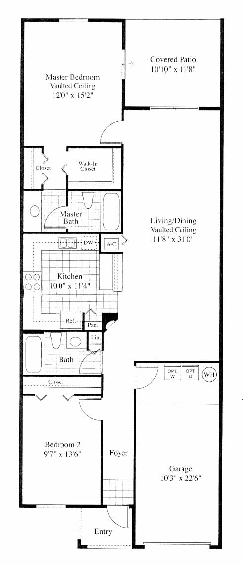 This villa home has a spacious living/dining area where entertaining will be enjoyable and includes a covered patio. The kitchen includes a pantry and ample counter space for preparing meals. The master bedroom at the back includes a walk-in closet and master bath. A second bedroom at the front has close access to a bath and has ample closet space.