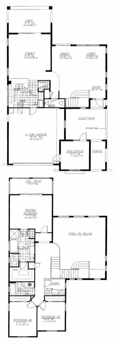 This home includes a private courtyard with a den to one side that makes for a great office. Enter the home into the combined dining and living rooms that includes access to the backyard. The kitchen includes a walk-in pantry and ample counter space for preparing meals. The family room is a nice space for entertaining guests and includes a lanai that is accessible through sliding doors. The second floor has all three bedrooms, including the master bedroom with private patio, oversized walk-in closet and master bath with double vanity, tub and separate shower. Two more bedrooms share a bath and are close to the laundry room. Views of the dining and living rooms can be seen below.
