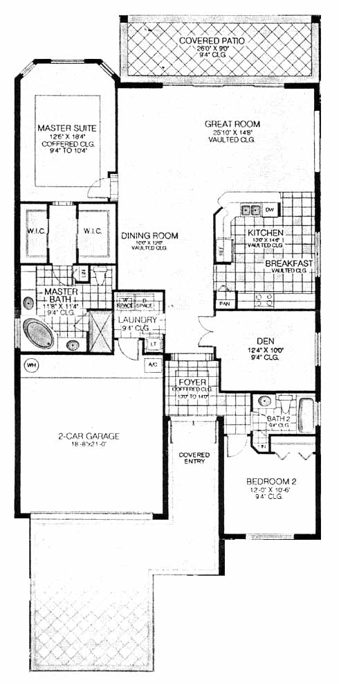 This home has two bedrooms and a shared bath to one side of the foyer entrance. The dining room leads to the great room with vaulted ceiling and access to a covered patio. The kitchen includes a pantry and breakfast area. The master suite has a master bath with garden tub and his and her walk-in closets.
