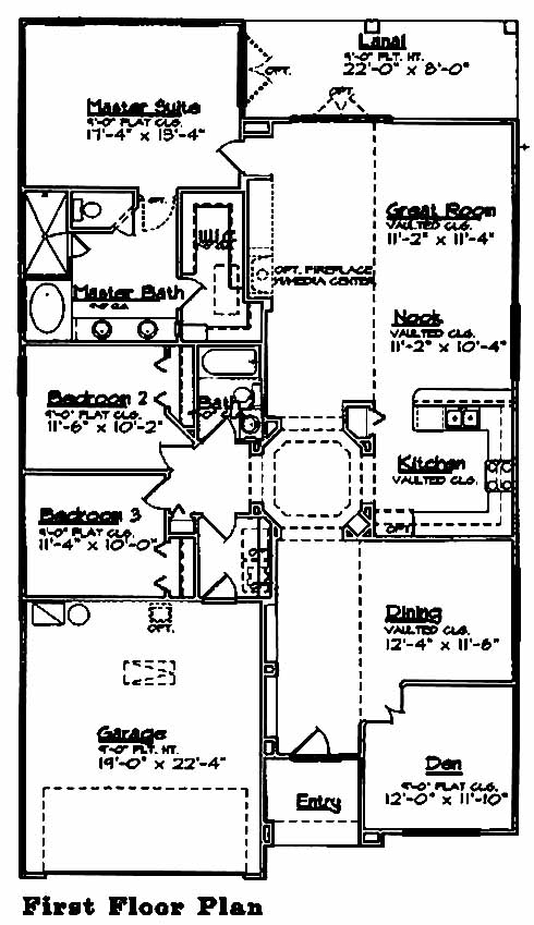 This home includes a den to one side of the foyer that makes a nice office. The dining room that follows has a vaulted ceiling and leads to the kitchen. The nook area overlooks the great room with lanai access. The master suite includes a walk-in closet and master bath with double vanity, tub and separate shower. Two more bedrooms share a bath.