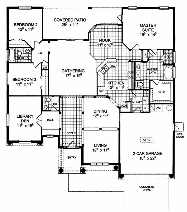 As you enter through the tiled foyer flanked by the living and dining room on one side and the library/den and powder room on another you'll walk down the hall to the gathering area. To your left is the 2nd and 3rd bedrooms with hall bath and to the right is the tiled kitchen with wrap around counter, pantry, breakfast nook and utility room,. Las but certainly not least is the master suite and tiled master bath with huge walk-in closet, shower and tub. This home also features a covered patio accessible from the master suite and gathering area.