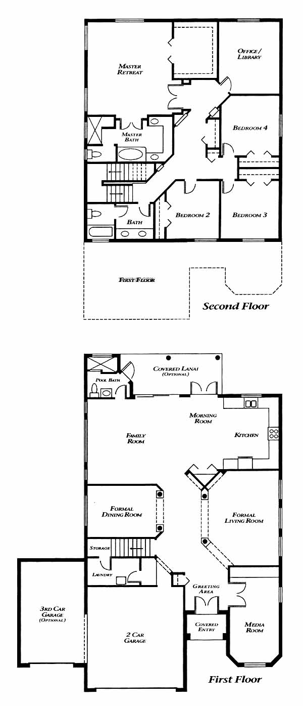 This model features a covered entry, greeting area, formal living and dining room, large family room, kitchen and morning room, covered lanai with attached pool bath, media room downstairs, a large Master retreat and bath, three additional bedrooms, office/library and a two car garage.