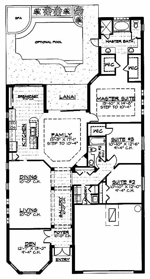 This home has a den at the front with bay windows that makes a beautiful office or reading room. Living and dining rooms are to one side of the gallery. The family room is a perfect spot for entertaining with its close access to the kitchen, breakfast area and lanai. The master suite includes his and her walk-in closets, a private bath with double vanity sinks and access to the optional pool. Two more bedrooms share a bath and are close to the laundry room.
