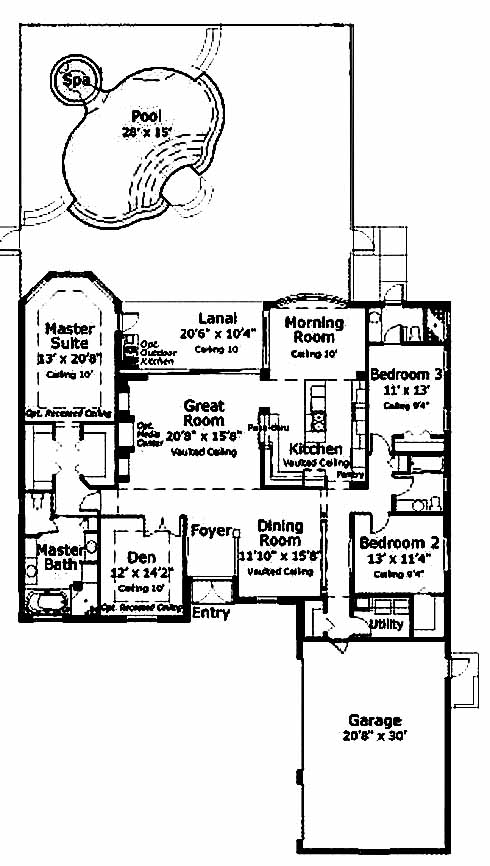 Exquisite master suite includes private lanai access, his and her walk-in closets and a luxurious master bath with dual vanities, soaking tub and separate shower. Two more bedrooms and two baths on the opposite side of the home provide plenty of privacy. The den at the front makes a nice home office. The formal dining room to one side of the foyer entrance leads to the kitchen with vaulted ceiling, pantry and pass-thru window. Entertain guests comfortably in the large great room with lanai access and optional media center. The morning room is a nice spot to read the morning paper and sip your coffee.