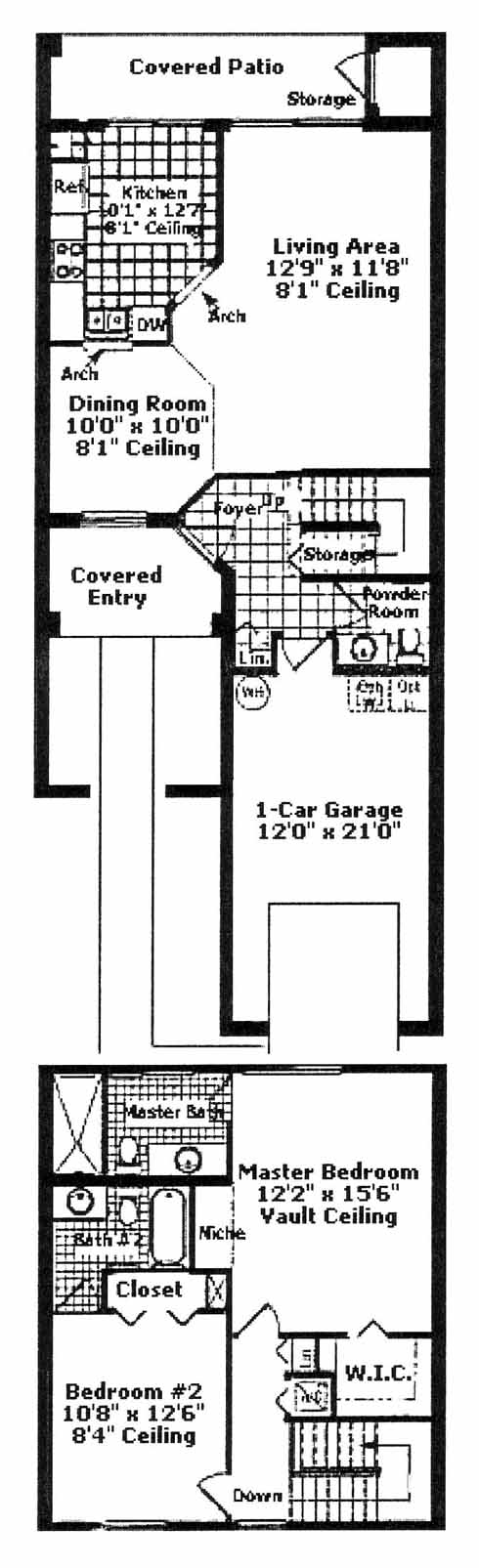 This townhome has a covered entry that opens into the foyer with dining room to one side. The living area includes access to the covered patio with storage in the back. The kitchen includes a pantry and ample counterspace. The second-floor master bedroom with vaulted ceiling includes a walk-in closet and private bath. A second bedroom also has a private bath.