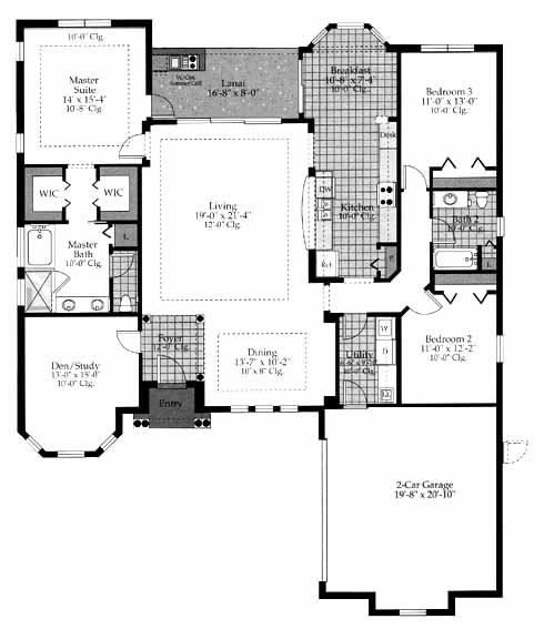 This home has a den and dining room at either side of the foyer entrance. The large living room will be a popular spot for friends and family alike and includes access to the lanai outside. The master suite has his and her walk-in closets, a luxurious private bath with tub, separate shower and double vanity and private access to the lanai. Two bedrooms on the opposite side share a bath between them. The kitchen includes a pantry, ample counter space and opens into the breakfast area with bay window.
