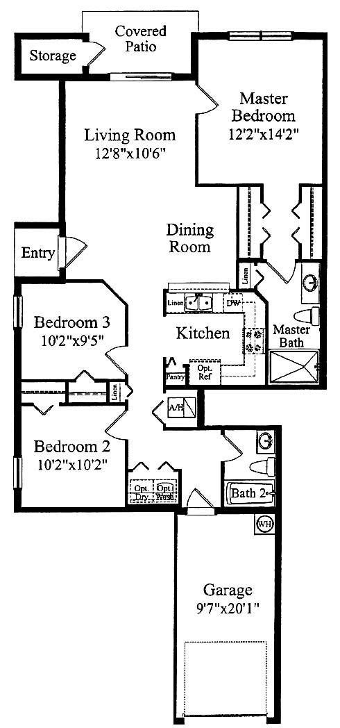Terrace home with side entry that opens into the living room with patio access. The kitchen has a pantry and ample counterspace for preparing meals while overlooking the dining room. The master bedroom in the back includes his and her closets and a master bath with linen closet. Two more bedrooms share a bath and have close access to the laundry area.