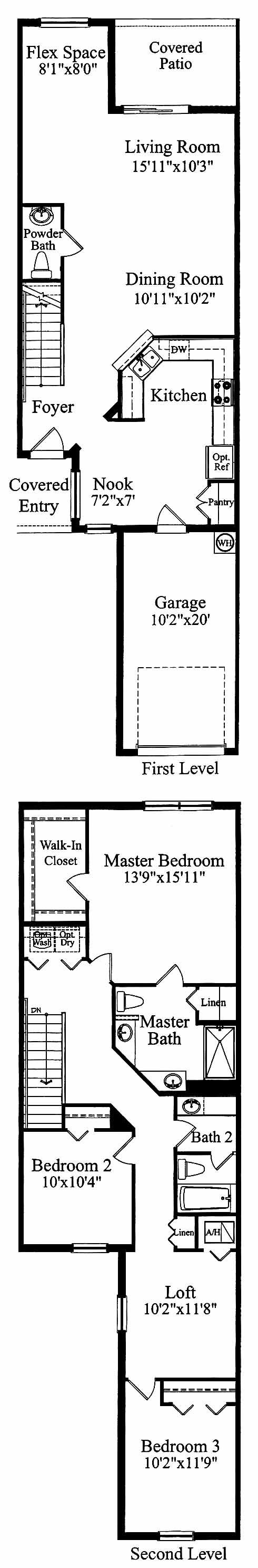 Large kitchen with pantry and ample counterspace opens into the nook. The dining room overlooks the living room with covered patio access. A flex space rounds out the first floor. The second-floor master bedroom includes a walk-in closet and master bath with double vanity. Two more bedrooms share a bath. The loft area makes a nice computer niche area.
