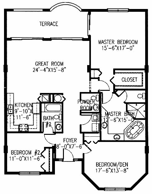Bedrooms on either side of the foyer entrance share a bath. The master bedroom in the back includes private terrace access, a walk-in closet and a master bath with double vanity, tub and separate shower. The kitchen has ample counterspace for preparing meals while overlooking the great room with terrace access.