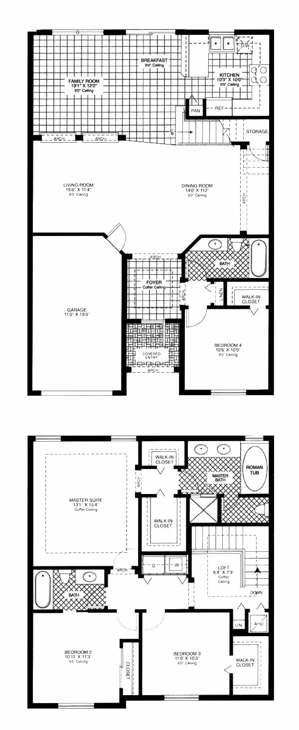 Two-story townhome with loft, family room, dining room, breakfast area, and one-car garage.