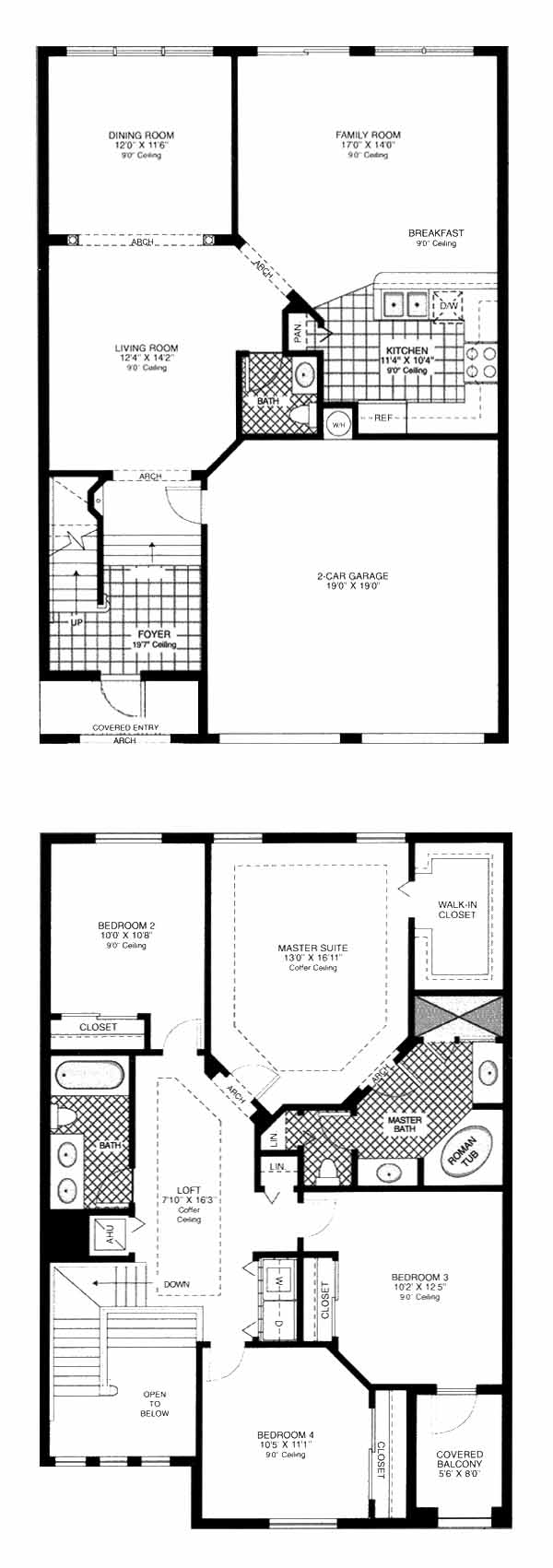 Two story townhome with loft, family room, dining room, breakfast area, and two-car garage.