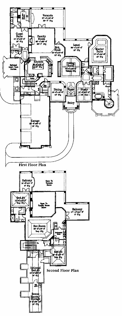 Formal dining and living rooms welcome guests into the home with views of the lanai in the back. The nearby study makes a nice home office. The kitchen includes an island workspace and walk-in pantry while overlooking the breakfast nook. The family room in the back includes veranda access, built-ins and a fireplace. The master suite includes a sitting area, lanai access, his and her walk-in closets and a master bath with dual vanities tub and separate shower. A guest suite on the opposite side of the home also has a private bath and access to the veranda and outdoor kitchen. The second floor has two more bedrooms, two baths and a recreation room that leads to a large balcony outside.